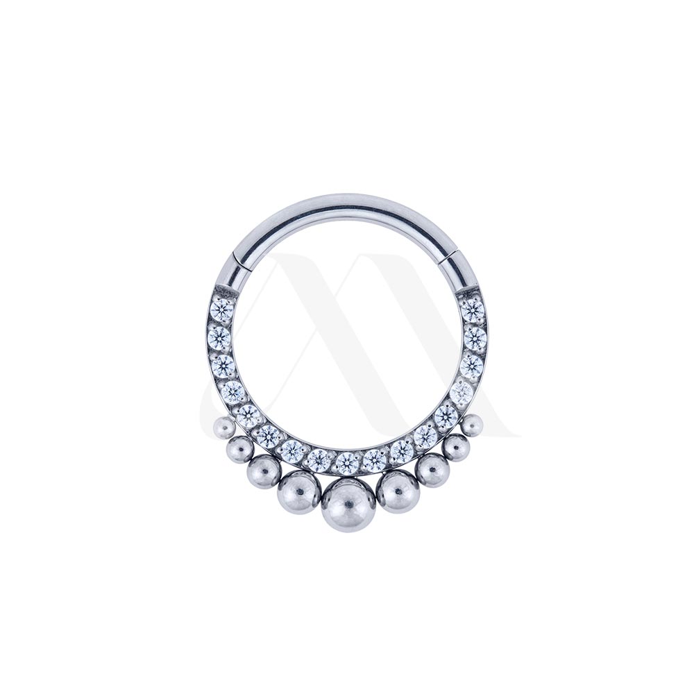 Argolla con cierre clicker, con fila de cristales y otra fila de filigranas de mayor a menos tamaña desde el centro hasta sus laterales.